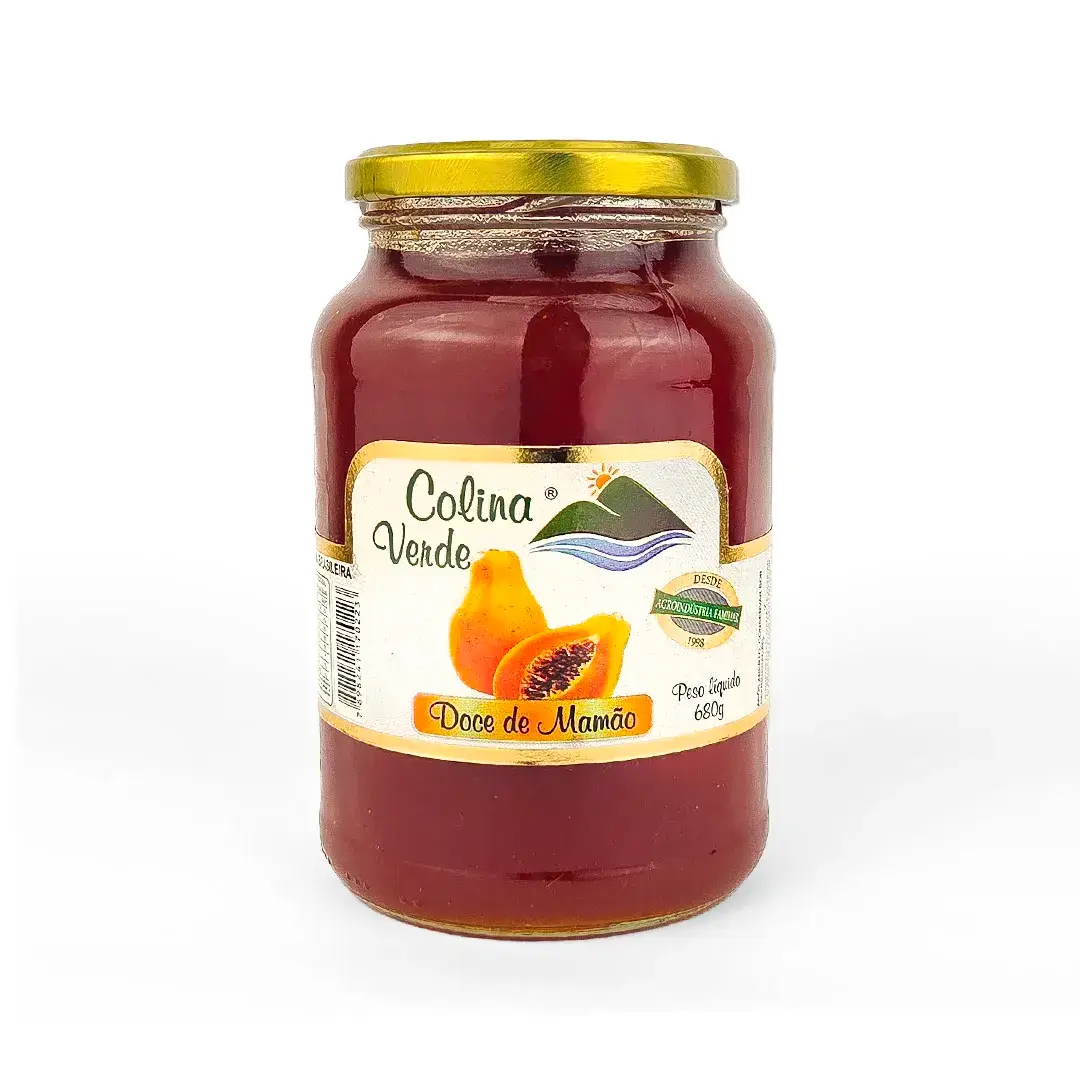 O Doce de Mamão - Colina Verde é produzido com ingredientes selecionados e preparo tradicional, preservando o sabor natural da fruta e a textura característica de um doce caseiro.
