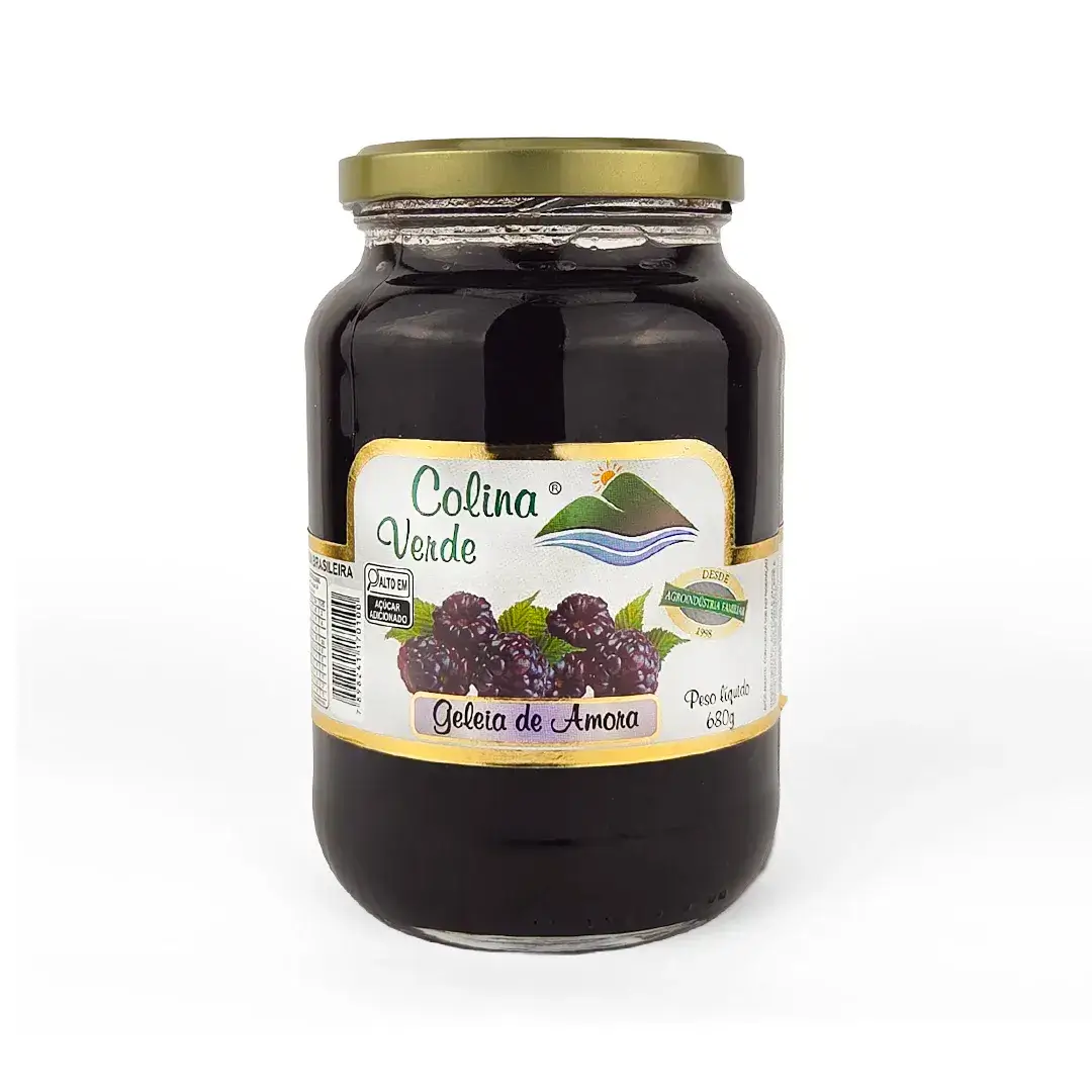 A Geleia de Amora - Colina Verde é produzida com ingredientes selecionados e preparo tradicional, preservando o sabor natural da fruta e a textura característica de uma geleia caseira.