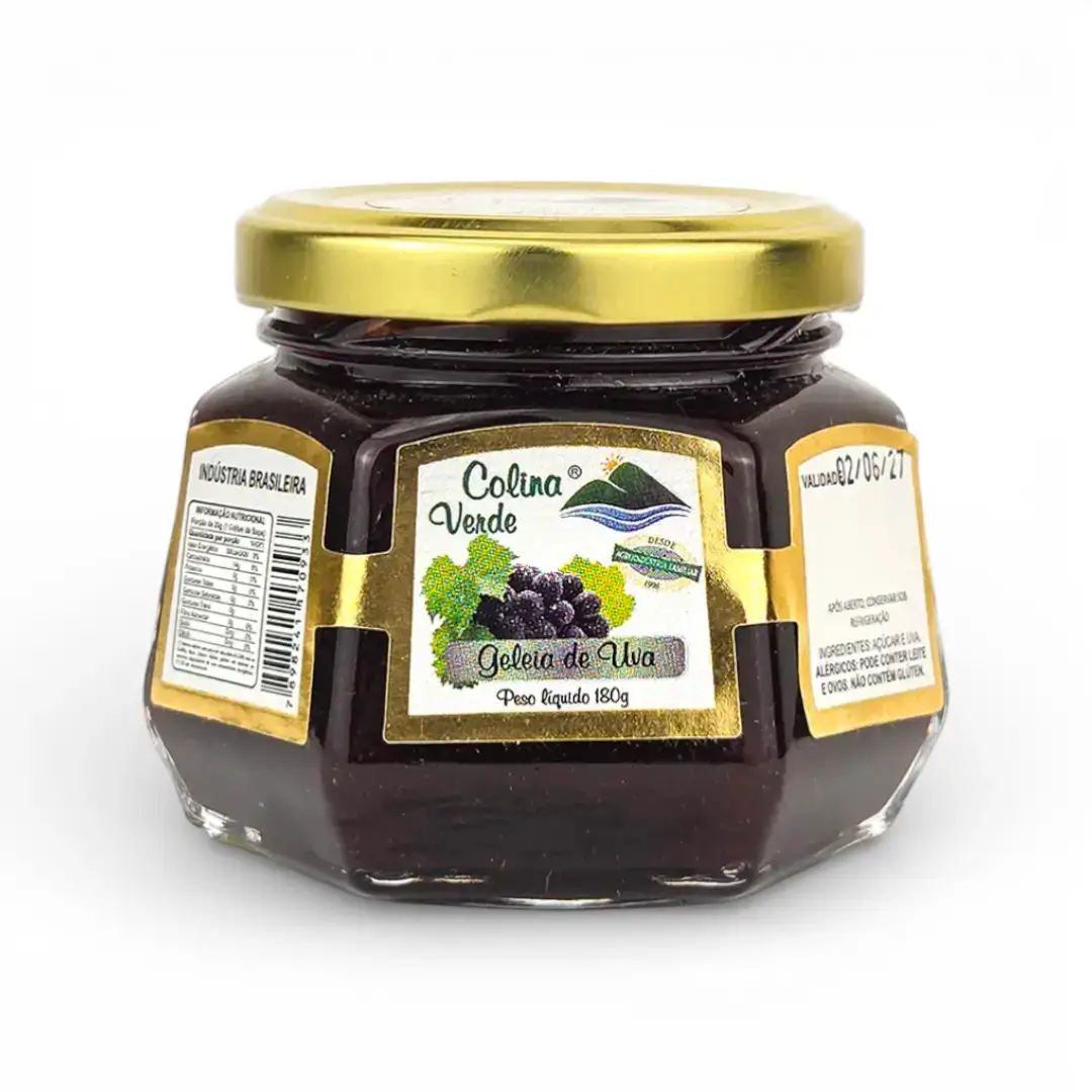 A Geleia de Uva - Colina Verde é produzida com ingredientes selecionados e preparo tradicional, preservando o sabor natural da fruta e a textura característica de uma geleia caseira.