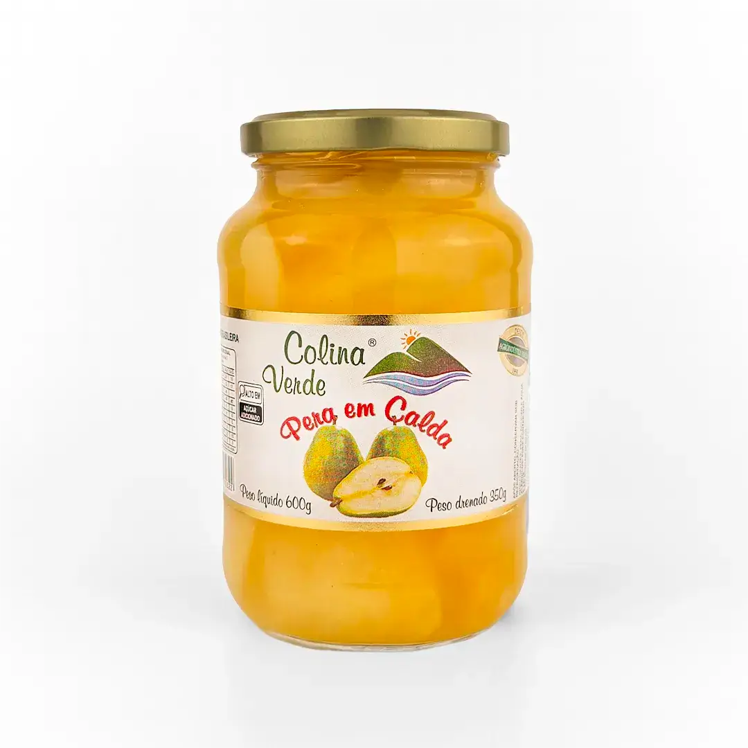 A Pera em Calda Colina Verde é um doce artesanal, produzido com peras selecionadas e preparo cuidadoso, preservando a suavidade e o frescor da fruta.